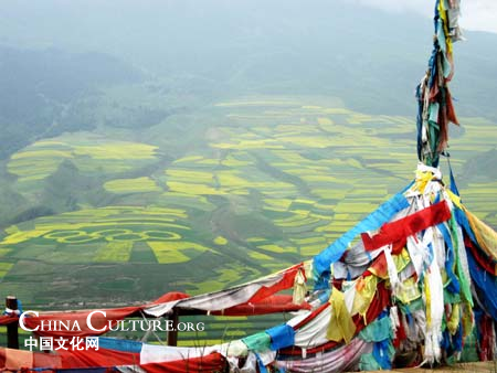 Photo taken on July 29, 2008 shows an Olympic Five-Ring logo consisting of cole flowers and sutra streamers on the Zhuo'er Mountains in Babao township of Qilian county, northwest China's Qinghai province. Local people plant cole and crop in the pattern of an Olympic Five-Ring logo to express their best wishes to the upcoming Beijing 2008 Olympic Games.