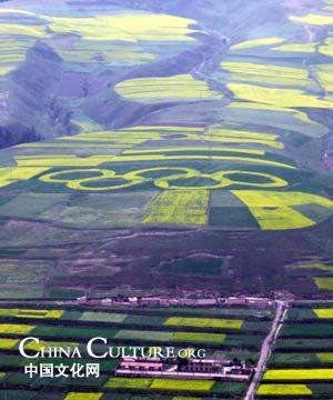 Photo taken on July 29, 2008 shows an Olympic Five-Ring logo consisting of cole flowers in Babao township of Qilian county, northwest China's Qinghai province. Local people plant cole and crop in the pattern of an Olympic Five-Ring logo to express their best wishes to the upcoming Beijing 2008 Olympic Games.