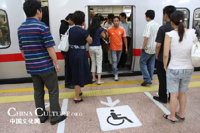 Photo taken on Aug. 27, 2008 shows the barrier-free sign on the ground at a subway station in Beijing, capital of China. Numbers of barrier-free signs have appeared recently at Beijing subway stations as the Beijing Paralympic Games approaches.