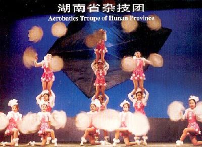 The Acrobatics Troupe of Hunan Province was founded in September 1959. The Acrobatics Troupe won prizes many times in the acrobatic contests at home and abroad. The programs Two Persons Climbing the Pole, Leather Belt, Bottles and Branches won the 2nd prizes in Central South Contest in Preparation for the 2nd National Acrobatics Contest in 1986; Silkworms Spin Silk and Balancing on the Ball won gold medals, and Acrobatic on a Bamboo Pole, Hoop Diving won silver medals in 1988 First National New Seeding Cup Acrobatics Contest. Silk-spinning Silkworms, Balancing on the Ball won silver medals in 1990 Belgium Expecting Star International Acrobatics Contest; Chairs Pyramid in Two Lines won the first prize and the prize of creation, Climbing Pole, Hoop Diving and Two Persons Twirling Lanterns won the second prizes in 1995 Third Central South Acrobatic Contest in 1995; Acrobatics on a Bamboo Pole and The Plastic Arts of Acrobatic Gymnastics won the first prizes in 1995 Central South Preliminary Contest for the Second National Acrobatics Contest; at the some year, The Plastic Arts of Acrobatic Gymnastics won the golden lion award and Acrobatics on the Bamboo Pole won silver lion award at the Fourth National Acrobatics Contest; Snow Carpet Twirling won the silver lion award and the prize of creation; Acrobatics on Four Bamboo Poles won the silver award in 1998's Third National Juvenile Acrobatic Contest.