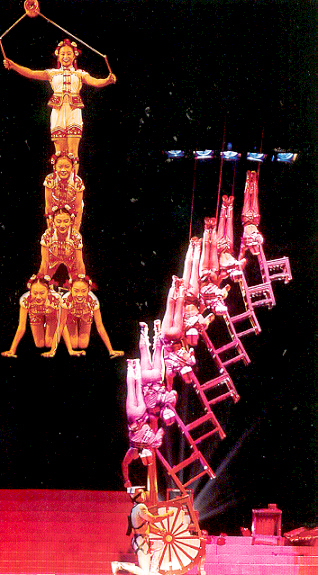 The troupe consists of several acrobatics and circus groups that specialize in acrobatics, aerial acts, animal training as well as humor and magic. Moreover, the troupe also has an international arts school with a vast range of faculties, including acrobatics, dance, acting,Kung fuand fine art -- although its main focus is acrobatics. The school has nurtured a great number of excellent acrobatics talents.
