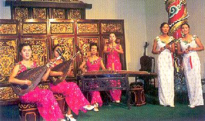 Nan Yue is also called Nan Yin, Nan Guan etc.. It is one kind of ancient music of our country. So far it is more than one thousand years old and has the name of living fossil of music. Since the establishment of the Ensemble, the music works created by the Ensemble include Thanks to Prince, Qin Yuan Chun . Snow, The Long March, meeting at Lin Jiang Loou and Gate to Gate Between Xiamen and Jinmen; the instrument works Fisherman's Song of Ming Hai, Hearing of Cuckoo etc.. All these programs got many prizes in the competitions at national, provincial and municipal levels. In the provincial compactions, one member won one gold, five members won silvers and two members won bronzes. It visited Japan, Singapore and the Philippines as well as Hong Kong and Taiwan regions for guest performances and cultural exchanges. It also held Nan Yue concerts for the heads of governments and states, such as Ajino, former president of the Philippines, the queen of the Netherlands etc., and got high praises from them.