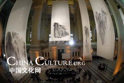 Huge Shanshui paintings, Chinese traditional painting style depicting scenery or natural landscapes, created by Chinese painter Xu Longsen are hanged at the atrium of the Justice Palace during the exhibition "On Top of A Thousand Mountains" in Brussels, capital of Belgium October 11, 2009. |