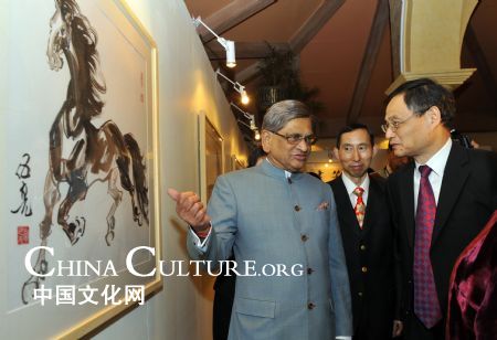Indian Foreign Minister S.M. Krishna (L) talks with Chinese Ambassador to India Zhang Yan (R) as they visit the exhibition "Spotlight on Chinese Ink Painting: International Art Exhibition in India" at Hotel Taj Mahal in New Delhi, capital of India, Dec. 23, 2009. |