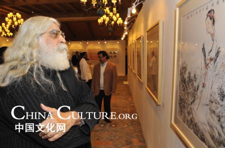 A visitor watches a Chinese ink painting work during the exhibition "Spotlight on Chinese Ink Painting: International Art Exhibition in India" at Hotel Taj Mahal in New Delhi, capital of India, Dec. 23, 2009. |