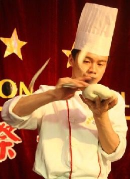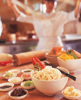 A noodle chef making shaved noodles is a sight to be seen. There is a phrase that describes his noodle-making: "One noodle in the boiling water, one flying in the air, and one just being cut." The chef stands in front of a big pot of boiling water, with a piece of noodle dough about the size of a thick bamboo trunk in one hand and a special shaving knife (similar to a trowel) in the other. He shaves off slips of the dough, which drop into the boiling water.