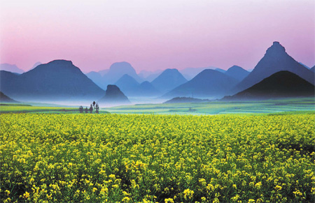 Fields of blooming rapeseed flowers are bathed in the morning sunlight in Luoping, Yunnan province, which is known for its unique karst landscape. Hu Liangfu / for China Daily |