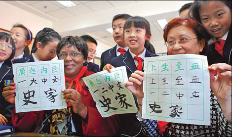 Joan Chong Leung (right), wife to the Mauritius ambassador, and Harriet K. Nyirenda, wife of a Zambian diplomat, practice calligraphy with students of Shijia Primary School on Monday. [Photo/China Daily] |