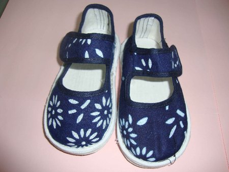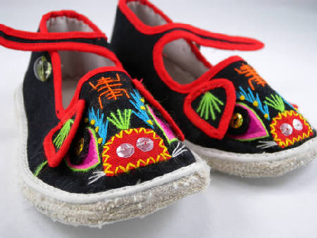 Cloth shoes win lots of praise from users not only for its comfort, but also for its artistic characteristics. Their beautiful appearance involves the traditional art of paper-cut and embroidering, always taking colors and shapes into consideration. Cloth shoes are considered to be folk art in its shape, patterns and colors.