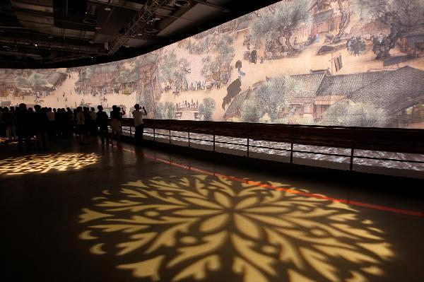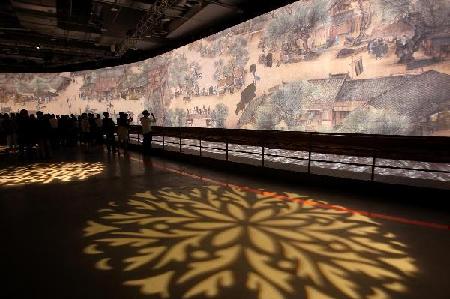 Visitors watch the animated version of ancient painting Riverside Scene at the Qingming Festival in Taipei, southeast China's Taiwan, June 30, 2011. The animated version of the Qingming scroll, a highly renowned piece of Chinese painting dating back some 900 years ago, started to be exhibited in Taipei on Thursday. The painting will be projected onto a six-meter-high and 110-meter-wide screen, magnified by 10 times of the scroll's original size. (Xinhua/Li Mingfang) |