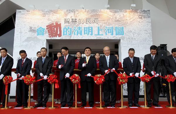 Guests cut the ribbon at the opening ceremony of the exhibition of the animated version of ancient painting Riverside Scene at the Qingming Festival, in Taipei, southeast China's Taiwan, June 30, 2011. The animated version of the Qingming scroll, a highly renowned piece of Chinese painting dating back some 900 years ago, started to be exhibited in Taipei on Thursday. The painting will be projected onto a six-meter-high and 110-meter-wide screen, magnified by 10 times of the scroll's original size. (Xinhua/Li Mingfang) |