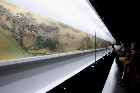 Visitors watch the animated version of ancient painting Riverside Scene at the Qingming Festival in Taipei, southeast China's Taiwan, June 30, 2011. The animated version of the Qingming scroll, a highly renowned piece of Chinese painting dating back some 900 years ago, started to be exhibited in Taipei on Thursday. The painting will be projected onto a six-meter-high and 110-meter-wide screen, magnified by 10 times of the scroll's original size. (Xinhua/Li Mingfang) |