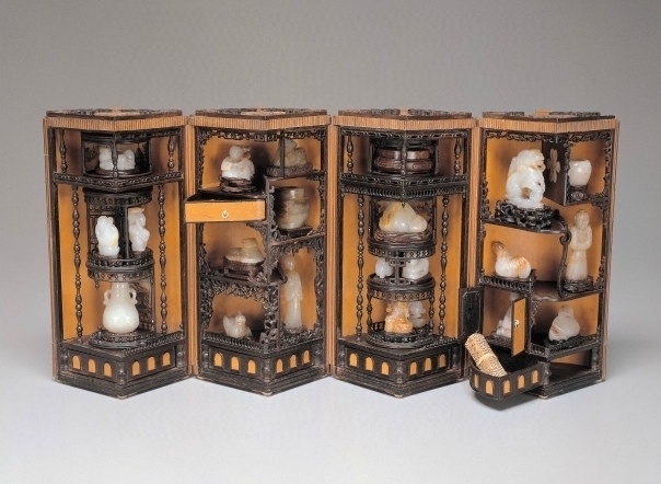 The curio box houses a total of 27 individual curios. In addition to ancient and Qing Dynasty jades, there are also hand scroll paintings and albums by artists who worked for the court of Emperor Qianlong (1736-1795). Each triangular drawer in the lower section of the quadrants contains a hand scroll, but only three remain today: a landscape by Fang Zung and two paintings of flowers -- one by Yang Dazhang and the other by Li Bingde -- each measuring only seven cm in length. One of these triangular drawers also contains an album of figure painting by artist Jin Yanbiao, measuring roughly three cm along each side. These paintings are the smallest examples in the collection at the National Palace Museum.