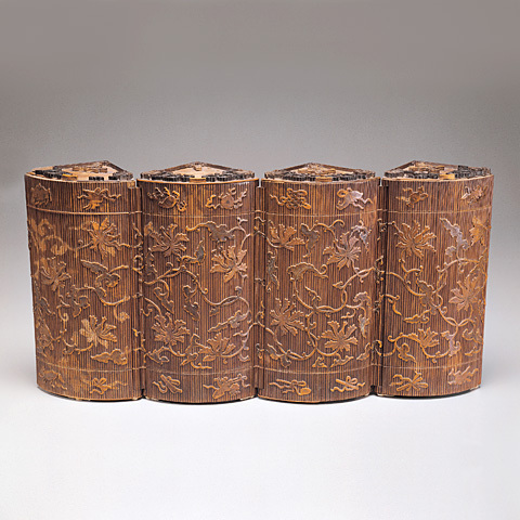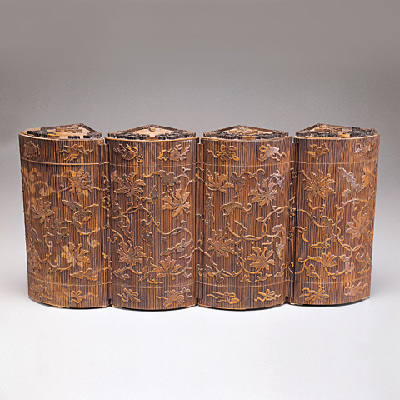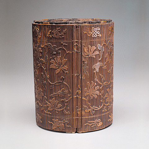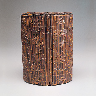 Bamboo-veneered curio box with lotusesQing Dynasty (1644-1911)Height: 24.5 cm, diameter: 18.5 cm |