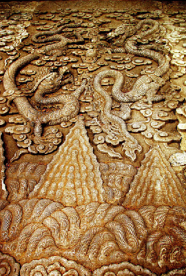 With the collision of Buddhist art and traditional Chinese art, the dragon from the Wei (220-265) and Jin (265-581) dynasties had ripples and a longer body and limbs. During the Sui (581-618) and Tang (618-907) dynasties, dragons, with curly grass carving patterns, were always decorated on steles. In the Song (960-1279) and Yuan (1271-1368) periods, the shape of the dragon developed into a unique style as well as inheriting traditional techniques. In Ming (136-1644) and Qing (1644-1911) dynasties, the dragon and phoenix were used to represent emperors and their consorts and were the main decorative patterns seen on various imperial structures. palaces, columns, pathways and screen walls were all inscribed, carved or painted with their images.