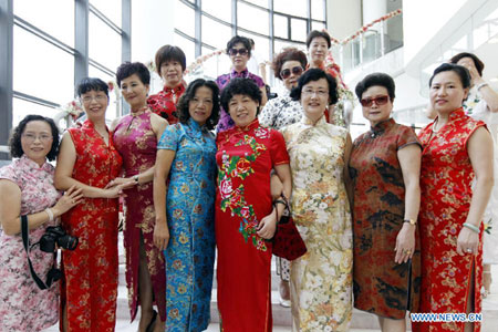 Women are dressed in cheongsam, a traditional Chinese women's dress also known as Qipao, at a cheongsam exhibiting and promoting activity in east China's Shanghai, June 29, 2012. (Xinhua/Ren Long) |