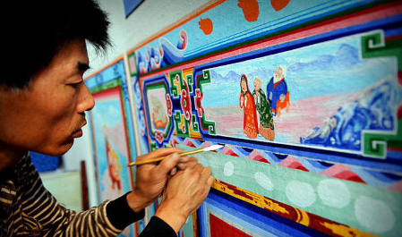 The Kangweihua is a painting drawn around the walls of a Kang, brick-built bed widely used in northern China.?Such a ?bed has a fireplace installed below, creating a warm environment in the winter. Kangweihua helps keep the mud walls’ surface from cracking and falling onto the unsuspecting sleeper, keep the quilt and clothes tidy, and also, decorate the bedroom.?It?was?common in the villages?of Shanxi province up until the 1980s.?