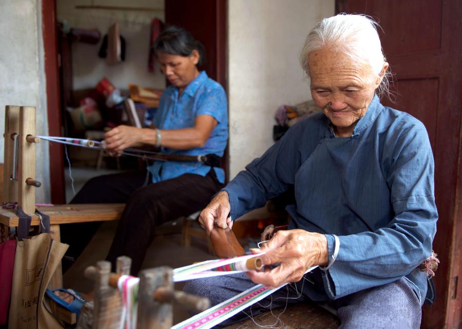 A countrywoman named Zhao Guiying (R) weaves a folk craftwork called "xiuhuadaier" by using an old-fashioned loom in Guli Village, Cangwu County, south China's Guangxi Zhuang Autonomous Region, Aug. 2, 2012. The "xiuhuadaier" is a kind of folk craftwork made by weaving and embroidery.(Xinhua/Zhang Zhoulai) |