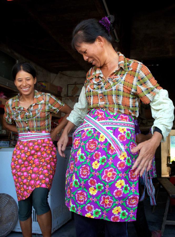 Countrywomen named Li Xueqiong (R) and He Bingqing show their aprons with "xiuhuadaier" in Guli Village, Cangwu County, south China's Guangxi Zhuang Autonomous Region, Aug. 2, 2012. The "xiuhuadaier" is a kind of folk craftwork made by weaving and embroidery.(Xinhua/Zhang Zhoulai) |