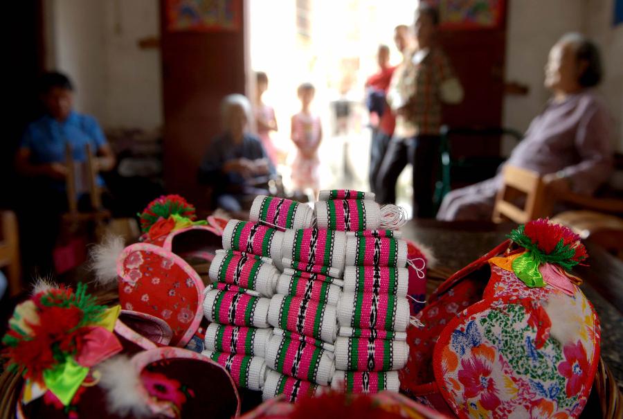 Photo taken on Aug. 2, 2012 shows folk craftwork called "xiuhuadaier" made by local residents in Guli Village, Cangwu County, south China's Guangxi Zhuang Autonomous Region. The "xiuhuadaier" is a kind of folk craftwork made by weaving and embroidery.(Xinhua/Zhang Zhoulai) |