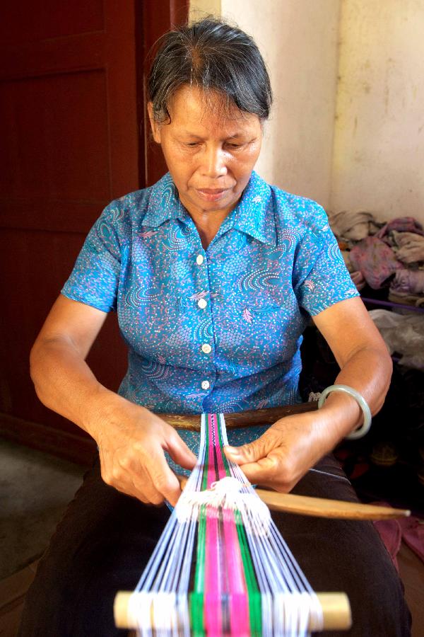 A countrywoman named Zuo Xueqiong weaves a folk craftwork called "xiuhuadaier" by using an old-fashioned loom in Guli Village, Cangwu County, south China's Guangxi Zhuang Autonomous Region, Aug. 2, 2012. The "xiuhuadaier" is a kind of folk craftwork made by weaving and embroidery.(Xinhua/Zhang Zhoulai) |