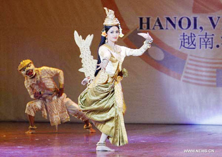 Performers of Laos dance during the 2012 ASEAN-China Youth Dance Exhibition in Vietnam's capital Hanoi on Aug 16, 2012. The event kicked off Thursday on the sideline of the Seventh Conference on China-ASEAN People-to-People Friendship Organizations.[Photo/Xinhua] |