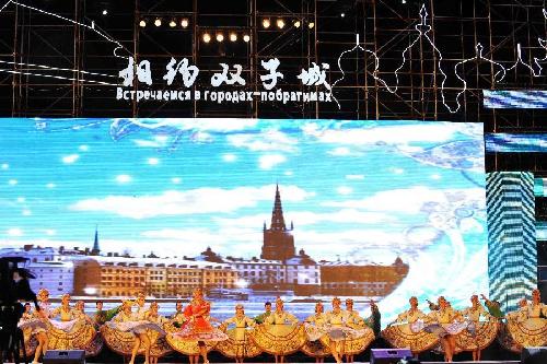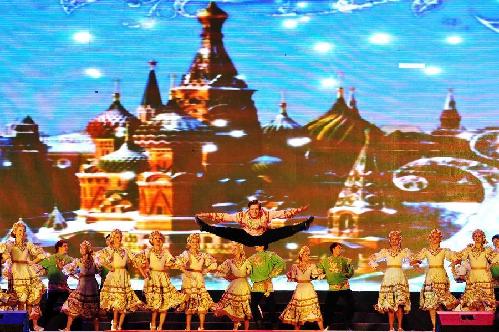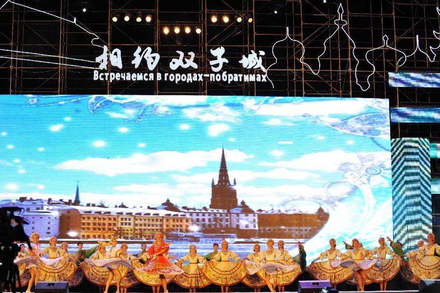 Russians perform at the Chinese opening ceremony of the 3rd China-Russia Cultural Festival in Heihe City, northeast China's Heilongjiang Province, Aug. 19, 2012. The seven-day festival, consisting of six parts including cultural exhibitions and art performances, is held simultaneously in both China's Heihe and Russia's Blagoveshchensk from Aug. 18. (Xinhua/Wang Jianwei) |