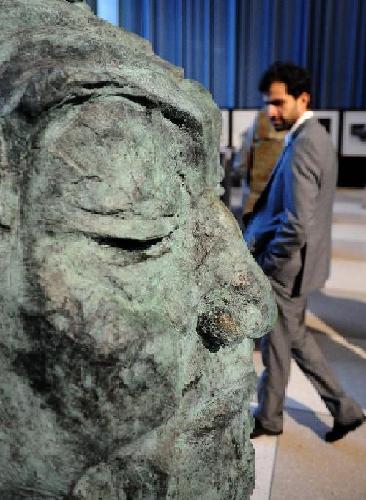 A visitor looks at one of Wu Weishan's sculptures at the United Nations headquarters in New York, the United States, Sept. 4, 2012. Organized by the Chinese Ministry of Culture and the Chinese Permanent Mission to the UN, Sculpting the Soul of a Nation - An International Touring Exhibition of the Art of Wu Weishan·Special Exhibition at the United Nations kicked off here on Tuesday.(Xinhua/Shen Hong) |