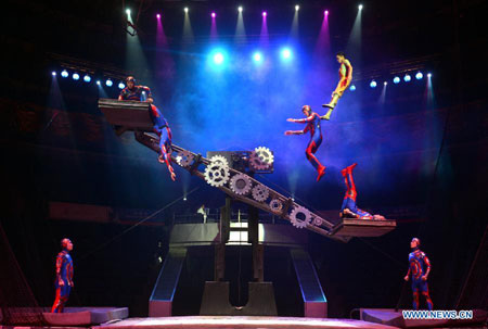Performers from Wuhan Acrobatic Troupe of China rehearse before the opening of Wuhan International Acrobatic Art Festival of China in Wuhan City, capital of central China's Hubei Province, Oct. 26, 2012. The acrobatic festival kicked off on Friday night, with participants from 16 countries and regions. (Xinhua) |