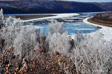 Trees are glazed with rime at the Bashili Dawan scenic spot in Huma County, northeast China's Heilongjiang Province, Nov. 7, 2012. The rime scenery here is able to last until late November. (Xinhua/Zhou Changping) |