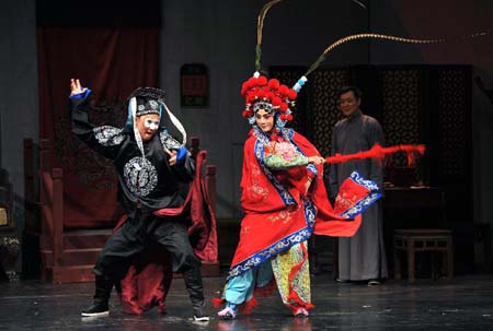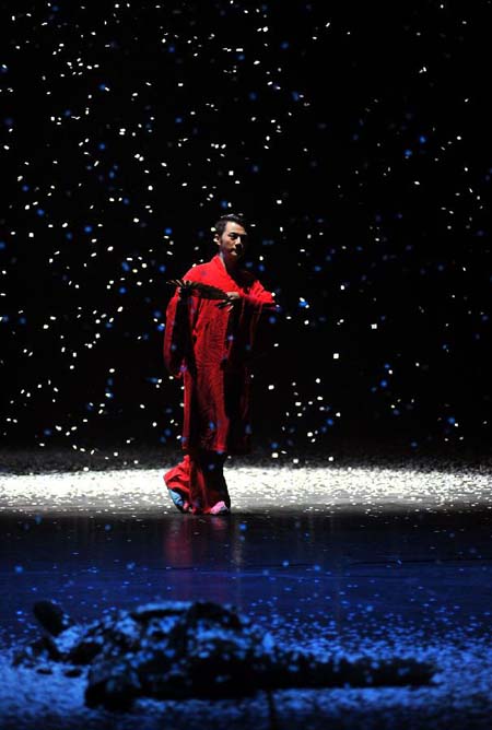 Actors preform during the rehearsal of the drama Return on a Snowy Night at National Center for the Performing Arts in Beijing, capital of China, Dec. 14, 2012. Return on a Snowy Night, a drama created by Chinese dramatist Wu Zuguang in the 1940s, tells a miserable story that Wei Liangsheng, a well-known Peking Opera performer, and Yuan Yuchun, a high-ranking official's concubine, fell in love with each other, then were split apart for 20 years and eventually became "butterfly lovers." |