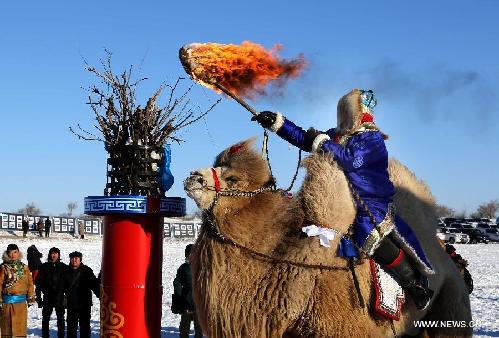 A herdsman lights a torch during a ceremony before camel racing in Xi Ujimqin Banner of north China's Inner Mongolia Autonomous Region, Jan. 5, 2013. A camel cultural festival kicked off here Jan. 5, which included camel racing, performance and training competition.