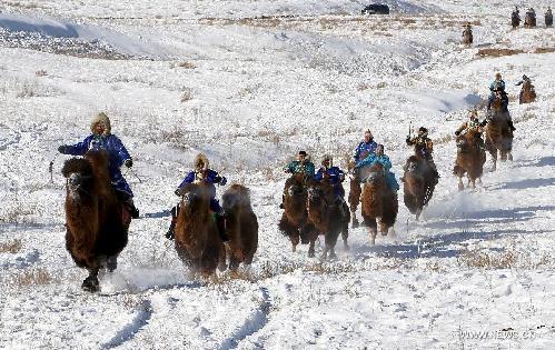 Herdsmen take part in a camel racing in Xi Ujimqin Banner of north China's Inner Mongolia Autonomous Region, Jan. 5, 2012. A camel cultural festival kicked off here Jan. 5, which included camel racing, performance and training competition.