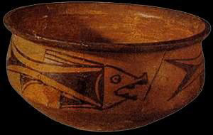 Yangshao cordmarked amphora, Banpo phase, 4800 BCE, Shaanxi.The Yangshao culture is well-known for its painted pottery. Yangshao artisans created fine white, red, and black painted pottery with human facial, animal, and geometric designs. Unlike the later Longshan culture, the Yangshao culture did not use pottery wheels in pottery-making. Excavations found that children were buried in painted pottery jars.