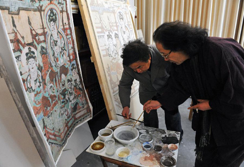 Teng Ting (R), the founder of a high temperature ceramic paints, and painter Shao Hongjiang from Dunhuang Academy work on a painting of the Grottoes together in Jingdezhen, east China's Jiangxi Province, Dec. 12, 2011. |