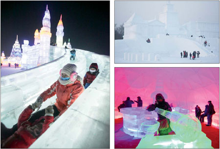 Clockwise from left: Visitors ride on ice slides in Harbin International Ice and Snow Festival. A large snow sculpture at Harbin's Sun Island Park. The ice lantern is among Zhaolin Park's iconic exhibitions during winter. Photos Provided to China Daily