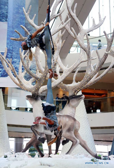 Australian performers perform stunt skills at the International Finance Center Mall in Hong Kong, south China, Dec. 13, 2012. A group of Autralian actors and actresses were invited to present 30 shows which combined stunts and dances in the mall from Thursday until Dec. 26, 2012. (Xinhua/Li Peng) |