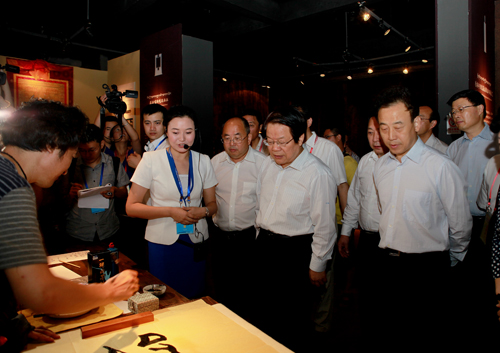 Cai Wu (center, front row), Minister of Culture of the People's Republic of China, visits the Intangible Cultural Heritage Exhibition at the Chinese Calligraphy Museum at the Chengdu Intangible Cultural Heritage Expo Garden on June 15. The 4th China Chengdu International Festival of the Intangible Cultural Heritage will continue through June 23 in Chengdu, Sichuan province.[photo/chinaculture.org]