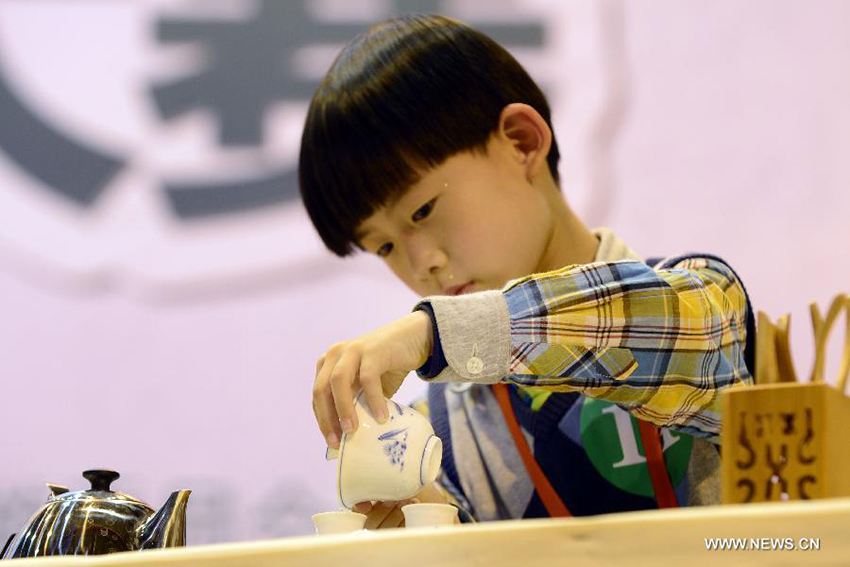 A boy performs tea art during a tea art competition among primary school pupils in Hangzhou, capital of east China's Zhejiang Province, April 12, 2014. A youth tea art competition kicked off in Hangzhou on Saturday, in which pupils of 19 groups presented their knowledge of tea and skills of tea art. (Xinhua/Li Zhong) |