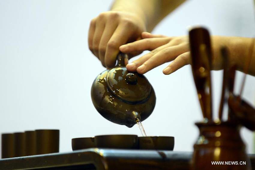 A contestant performs tea art during a tea art competition among primary school pupils in Hangzhou, capital of east China's Zhejiang Province, April 12, 2014. A youth tea art competition kicked off in Hangzhou on Saturday, in which pupils of 19 groups presented their knowledge of tea and skills of tea art. (Xinhua/Li Zhong)