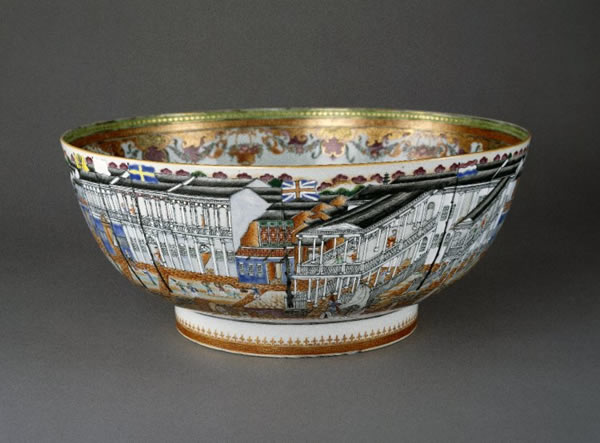 Punchbowl with Western trading offices on the Ghuangzhou waterfront, Qing Dynasty, about 1780–1790