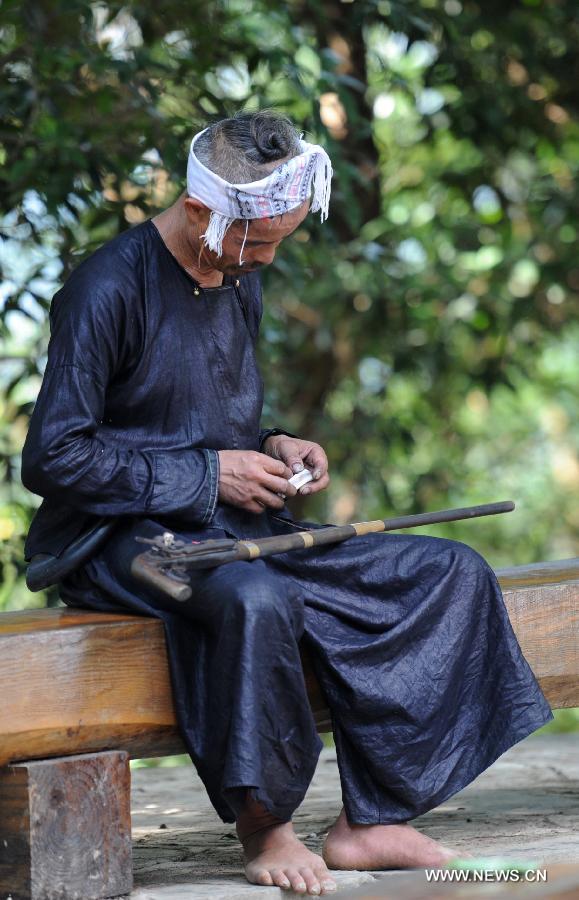 A man of the Miao ethnic reloads his gun at Biasha, a Miao ethic village in Congjiang County, Miao-Dong Autonomous Prefecture of Qiandongnan, southwest China's Guizhou Province, July 23, 2014. The local Miao people here stick to their traditional costumes dating back to thousands of years. Though guns are strictly regulated in China, men in Biasha are permitted to carry and use guns as to protect their tradition. Therefore, Biasha is called as the last gunslinger village in China and this draws more and more tourists here. (Xinhua/Tao Liang)