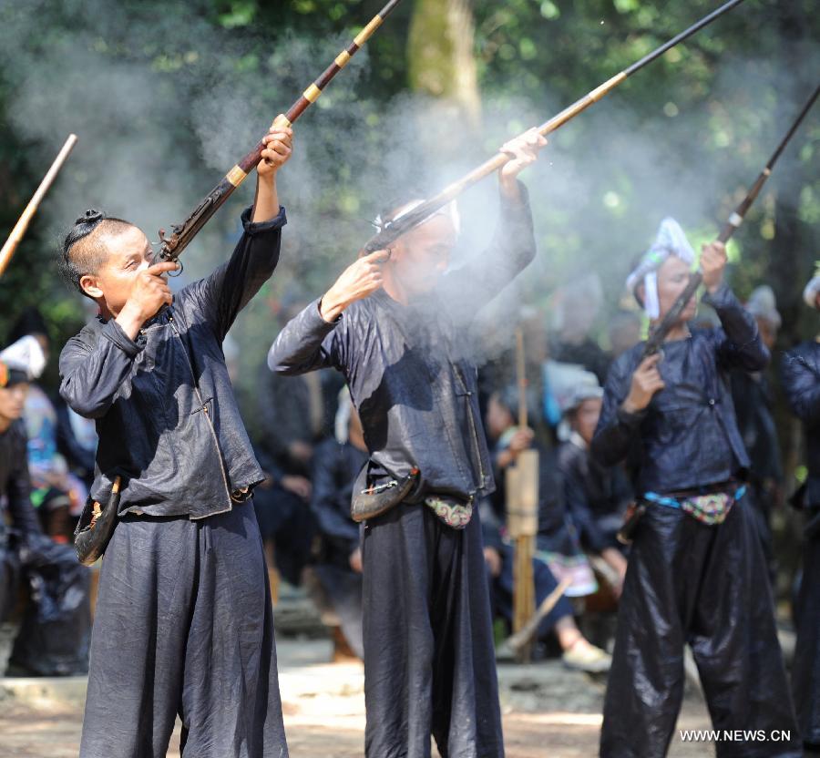 Men of the Miao ethnic fire rifles into the air to welcome guests at Biasha, a Miao ethic village in Congjiang County, Miao-Dong Autonomous Prefecture of Qiandongnan, southwest China's Guizhou Province, July 23, 2014. The local Miao people here stick to their traditional costumes dating back to thousands of years. Though guns are strictly regulated in China, men in Biasha are permitted to carry and use guns as to protect their tradition. Therefore, Biasha is called as the last gunslinger village in China and this draws more and more tourists here. (Xinhua/Tao Liang)
