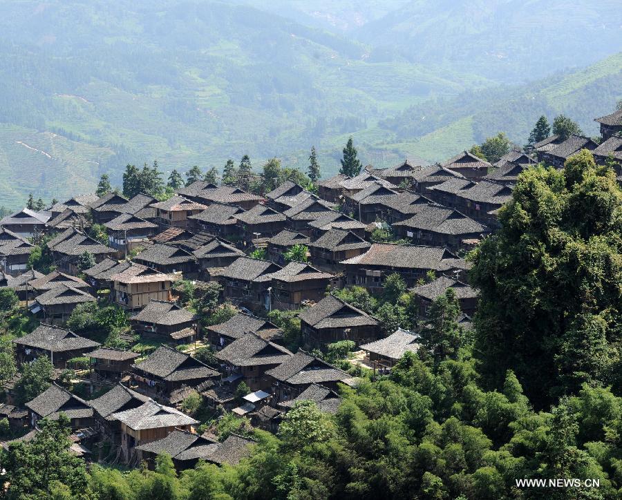 Photo taken on July 23, 2014 shows the stilted houses at Biasha, a Miao ethic village in Congjiang County, Miao-Dong Autonomous Prefecture of Qiandongnan, southwest China's Guizhou Province. The local Miao people here stick to their traditional costumes dating back to thousands of years. Though guns are strictly regulated in China, men in Biasha are permitted to carry and use guns as to protect their tradition. Therefore, Biasha is called as the last gunslinger village in China and this draws more and more tourists here. (Xinhua/Tao Liang)
