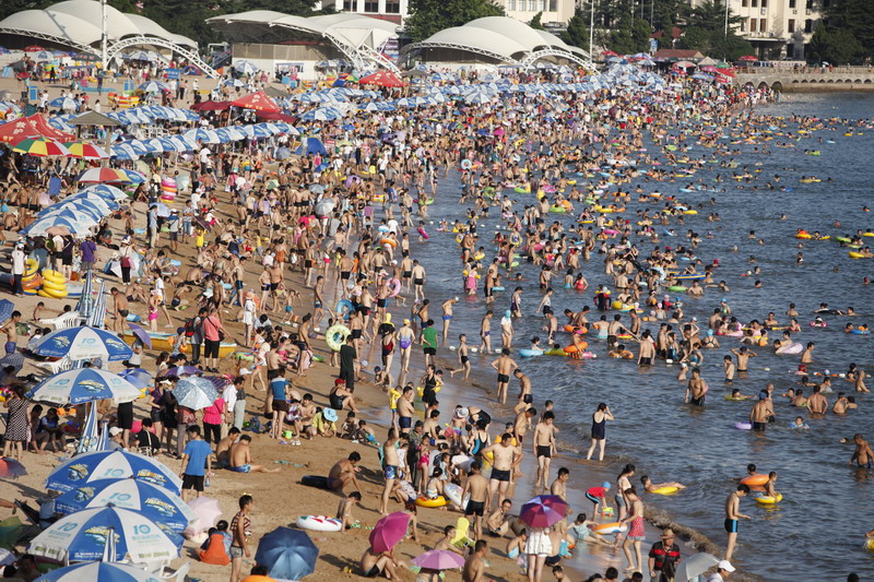 Tourists seek relief from the summer heat along the seashore, Qingdao,Shandongprovince, August 20, 2013. [Photo by Xiao Mi/asianewsphoto.com]