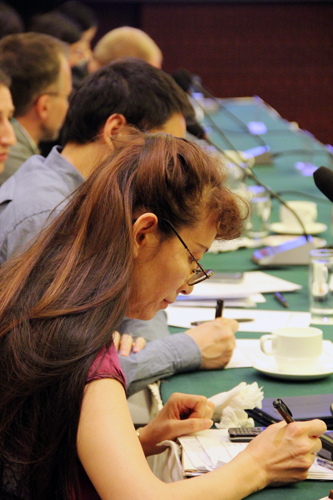Sinologists listen and take notes on what the contemporary writers of Chinese literature have to tell them in Beijing, Sept 18, 2014. Photo by Mei Jia/China Daily |