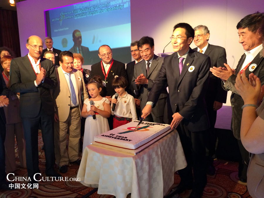 Gu Hongxing (second from right), the Director of the China Cultural Center in Malta and delegates cut the birthday cake at the forum. [Photo by Chen Xiaorong] |