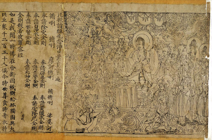 In 1900, an abbot named Wang Yuanlu came to Dunhuang and discovered the sand covered stone grottoes. In March 1907, a British expedition under Sir Aurel Stein arrived at Dunhuang and visited Wang in his cave. Stein took away a large amount of precious relics, manuscripts and paintings at the cost of 130 pounds. The Diamond Sutra is one of those relics. It displays dignified style, distinct ink color and skilful carving methods. The Diamond Sutra was printed in the year 868. It is recognized as the world’s earliest printed book, made of seven strips and paper, some 16 feet long, 17? feet long and 10? inches wide. It used to be housed in the British Museum and now is in the British Library.