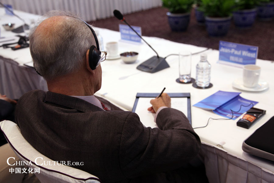 A foreign Sinologist takes notes as he listens to the speech on earphones via an interpretation system. [Photo by Liu Fang/Chinaculture.org] |