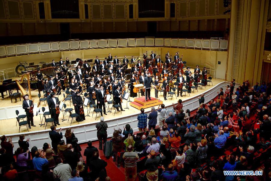 Artists from the China National Center for the Performing Arts (NCPA) Orchestra greet the audience after performance at Chicago Symphony Center in Chicago, the United States, on Nov. 2, 2014. The China NCPA Orchestra made the debut of its first-ever North America tour at Chicago Symphony Center on Sunday. [Photo/Xinhua]